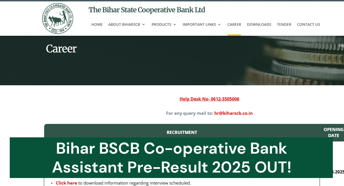 The Preliminary Exam Result of Bihar State Co-operative Bank Ltd. (BSCB) of the recruitment of the Assistant (Multipurpose)/customer service executive has officially been announced. The declaration of results was announced on 5 October 2025 for the exam being held on 31 August 2025. The given recruitment is expected to fill 257 Assistant vacancies in the Bihar State Co-operative Bank and many District Central Co-operative Banks (DCCBs). The successful candidates will be seen in the Mains examination on 22 November 2025.
